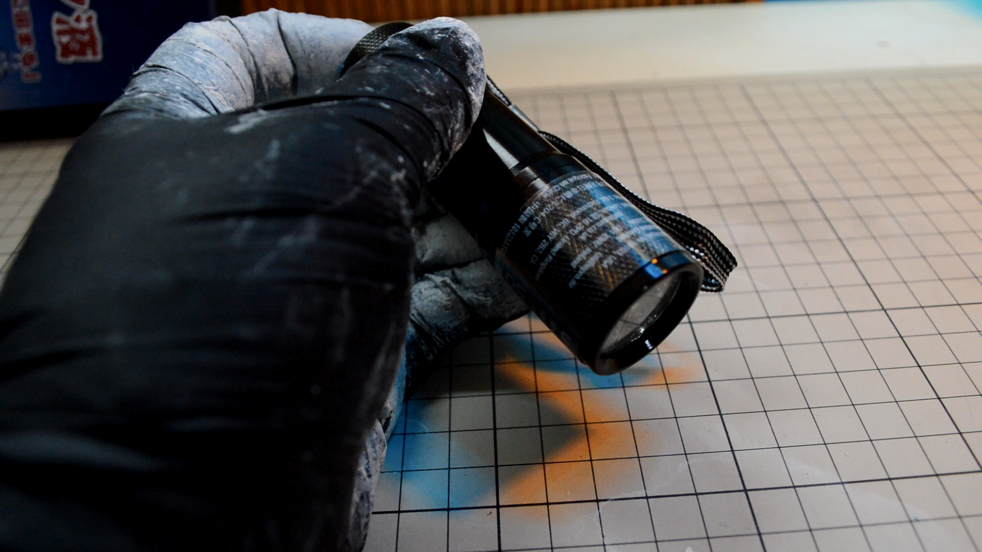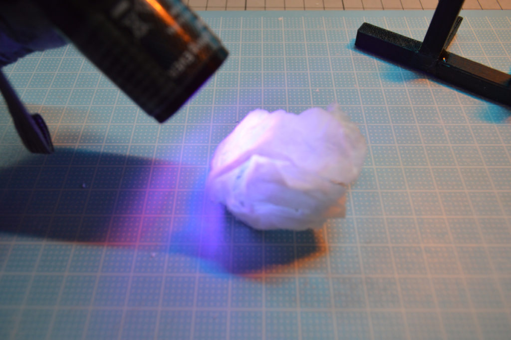 レジンを拭き取ったティッシュにUVライトを当てて硬化させると、