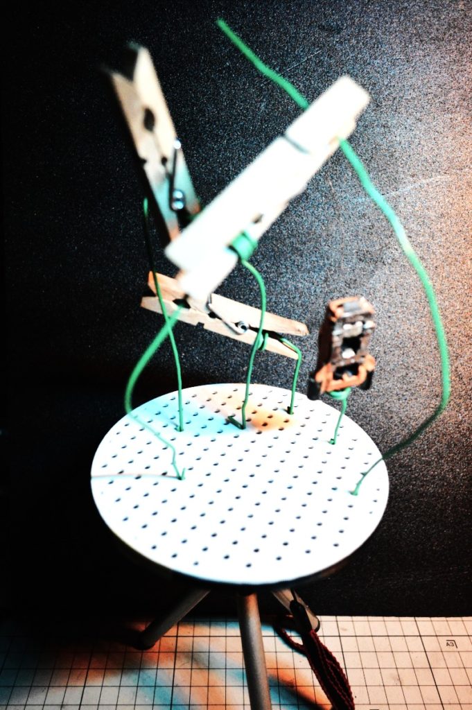 完成した作業台を、1/4インチネジのミニ三脚に取り付けるとこんな感じです。