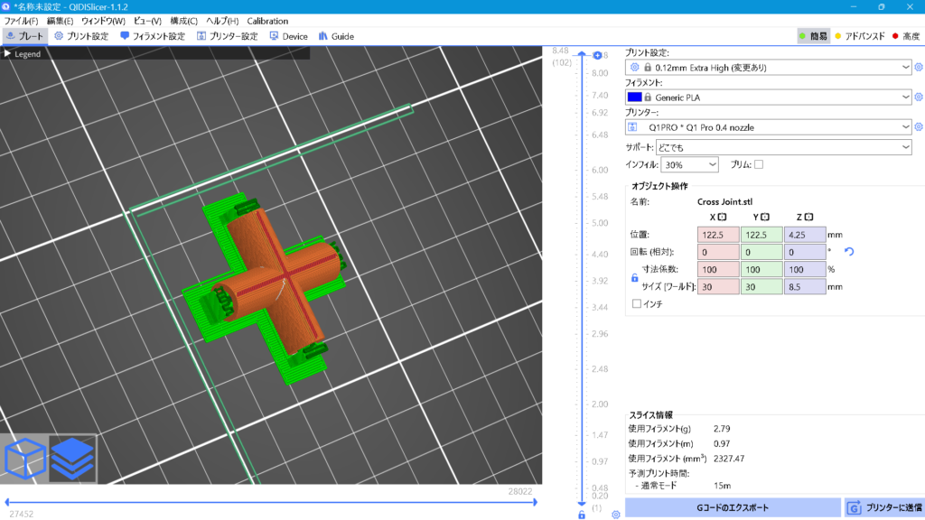 このモデルをサイズ100%、インフィル30%で印刷した時にかかるコスト