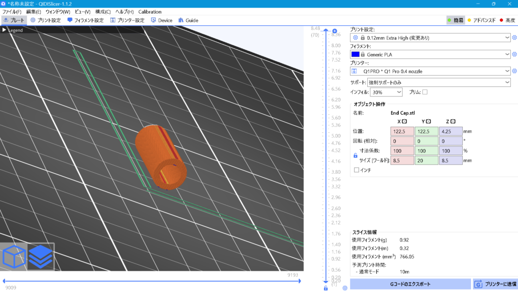 このモデルをサイズ100%、インフィル30%で印刷した時にかかるコスト