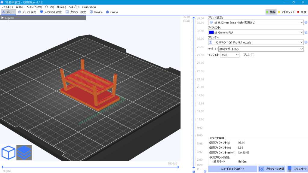 ミニテーブルのトップを底面に設定すると、トップの仕上がりが均一になり、サポート材も減らせそうです。中空部はサポート設定が必須の形状です。
