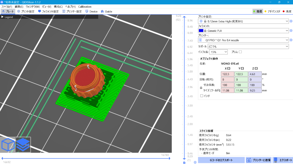 上画面の緑色がサポート部分です。非常に小さいパーツなので3Dプリントも数分で済みます。よく使うパーツなので複数作っておくと便利です。